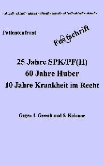 Mit der Bezeichnung SPK/PF(H) bzw. PF/SPK(H) heutzutage statt SPK bezwecken wir, Aspekte der aktuellen Authentizität und Unterschiede in der Entwicklung klarzustellen. Seit dem SPK haben wir freiwillig auf diese wohlbekannte Bezeichnung verzichtet und haben von neuem als Patientenfront (PF) gekämpft, öffentlich, wie früher das SPK, aber unter schwierigeren Bedingungen, weil unbekannt, und wir haben noch einmal von vorn angefangen mit nichts außer den grundlegenden Prinzipien, nämlich den PF-Prinzipien, die aus der Krankheit entwickelt wurden. Es sind unabhängig von uns mehr und mehr SPKs entstanden, beispielsweise in Berlin, Hamburg, Konstanz, Göttingen, Köln, Freiburg, in den Niederlanden, in Lyon, Frankreich und bis hin zur Musikband S.P.K. in Australien. Aber sie sind nach und nach alle bis Mitte der 80er Jahre verschwunden. Danach sind, im Zusammenhang mit uns, neue SPKs entstanden, wie z.B. SPK/PF (MFE) Österreich ('Patientenstimme'), desgleichen MFE Spanien, Griechenland, Brasilien, Kolumbien, Kanada und mehrere andere, die mit wachsender Wirkkraft bis heute weiterarbeiten. Um eine praktische Orientierung zu geben, haben wir uns von neuem SPK genannt, und zwar PF/SPK(H).