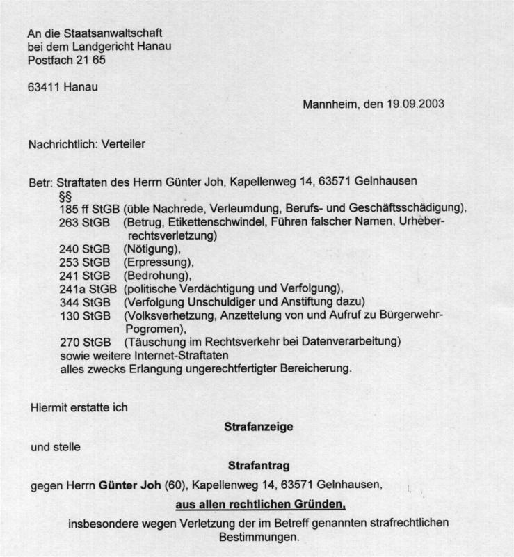 Dilettantismus, Etikettenschwindel, Hochstapelei, Pfuscherei und Feigheit, würdig nicht einmal eines alkoholenthirnten Korpsstudenten und, in objektiv-historiographischer Hinsicht, euthanazihafte Meuchel- und Heuchelfeigheit, abgesehen von den Straftaten, die er damit begeht. Schwerwiegende Folgestraftaten, z.B. durch Zerrüttung von Eltern-Kind-Beziehungen unter Außenstehenden, unter Dritten und insgesamt also Unschuldigen (Verfolgung Unschuldiger und Anstiftung dazu, § 344 StGB) sind nicht ausgeschlossen, wenn diese sein sektiererisches Pamphlet im Internet vor Augen bekommen. Jedenfalls hat der Angeschuldigte Joh bereits im Januar 2003 gedroht, er werde gegen mich "Aktionen starten". Es ist nicht auszuschließen, daß Herr Joh, Mitglied einer schlagenden Verbindung, welcher schon SPD-Anhänger als "gefährliche Linke" einstuft, damit auf Bürgerwehr-Aktionen gegen mich abzielt: Anstiftung zur Pogromhetze und Volksverhetzung (Aufruf zu Bürgerwehr-Pogromen, § 130 StGB).