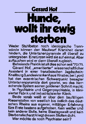 | Gérard Hof: Hunde, wollt ihr ewig sterben Übersetzung aus dem Französischen von Huber PF/SPK 1. Aufl. 1976, 2. Aufl. 1993, Gegen den Antipsychiatriehumbug. |