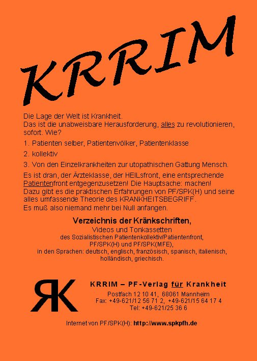 Fünf utopathische Revolutionen kraft Krankheit haben wir durchgeführt: das Sozialistische Patientenkollektiv, SPK, mit Huber, dem Gründer, hat seit 1965, ganz für seinen Teil, die herrschende Klasse abgeschafft (Null-Therapie), die herrschende Kultur (KRRIM-Verlag in krankheitskräftiger Funktion) und die herrschende Justiz (KRANKHEIT IM RECHT in krankheitskräftiger Funktion). Außerdem: Krankheit in die Musik eingeführt, und der elektronische Klassenkampf, unsere fünfte utopathische Revolution.