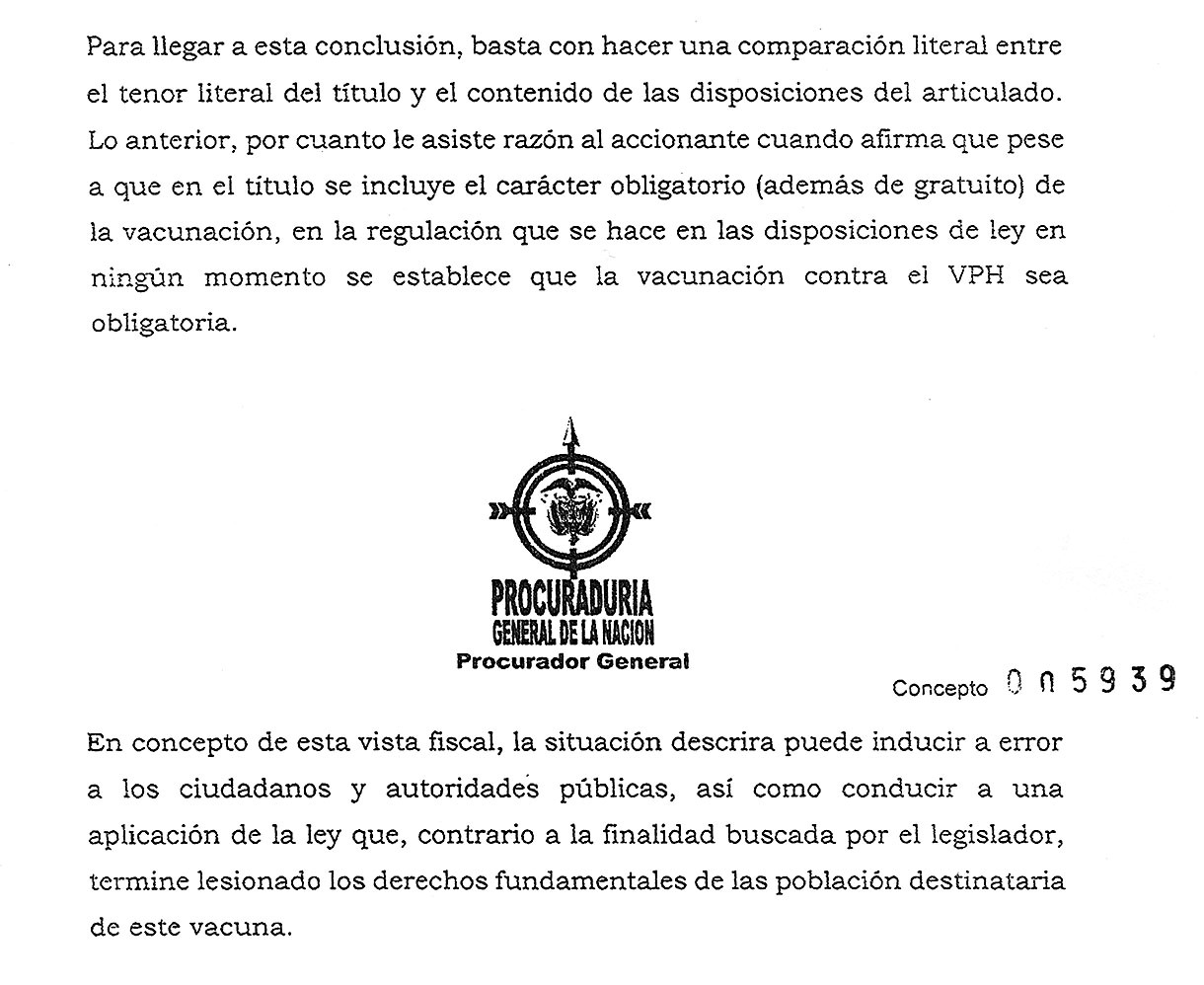 Mientras se resuelve nuestra demanda constitucional, el Procurador General de Colombia, Alejandro Ordóñez Maldonado, se ha pronunciado abiertamente a favor de nuestra demanda constitucional: La vacunación VPH no es obligatoria, el título de la Ley 1626 de 2013 es engañoso. "Por las razones expuestas, el Procurador General de la Nación le solicita a la Corte Constitucional declare INEXEQUIBLE la expresión "obligatoria" contenida en el título de la Ley 1626 de 2013, por los cargos aquí analizados", porque "lo contrario generaría un caos y una confusión jurídica, llevando, a la postre, a la vulneración de derechos fundamentales", así el Procurador General en su escrito ("concepto") del 5 de agosto de 2015 a la Corte Constitucional refiriéndose y así adhiriéndose a nuestra demanda constitucional.