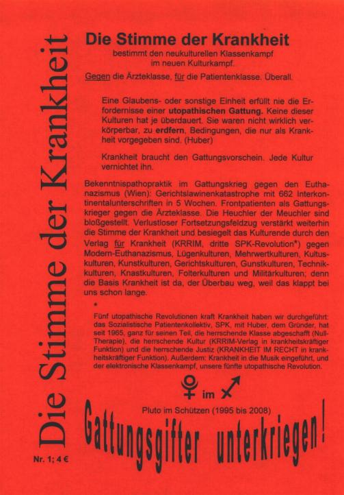 Bei der Auswahl unserer Beiträge im vorliegenden Heft brauchten uns geographische Unterschiede kaum zu interessieren, sind wir doch mit Krankheit sowieso längst schon allüberall in der Unterschiedslosigkeit der Ununterscheidbarkeit, oder nirgendwo zu fassen, geschweige denn begründetermaßen zu hassen. Der euthanazistischen Ausmerzbereitschaft wußten wir im elektronischen Klassenkampf vom Start weg wirksam zu begegnen. Und kraß hervorgetreten ist selbige nun einmal in Wien: befremdlich fromme Züge hat sie dort angenommen, bevor sie unter der Eigenlast der weltweit herrschenden Ärzteklasse schmählich zu Bruch gegangen ist am so entschlossenen, wie wohlfundierten Angriffs-Richtspruch SPK.