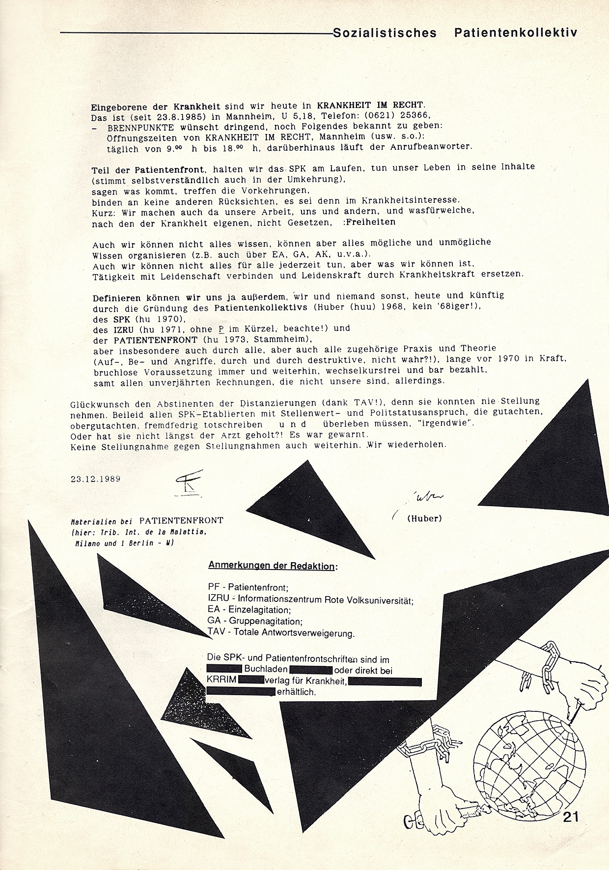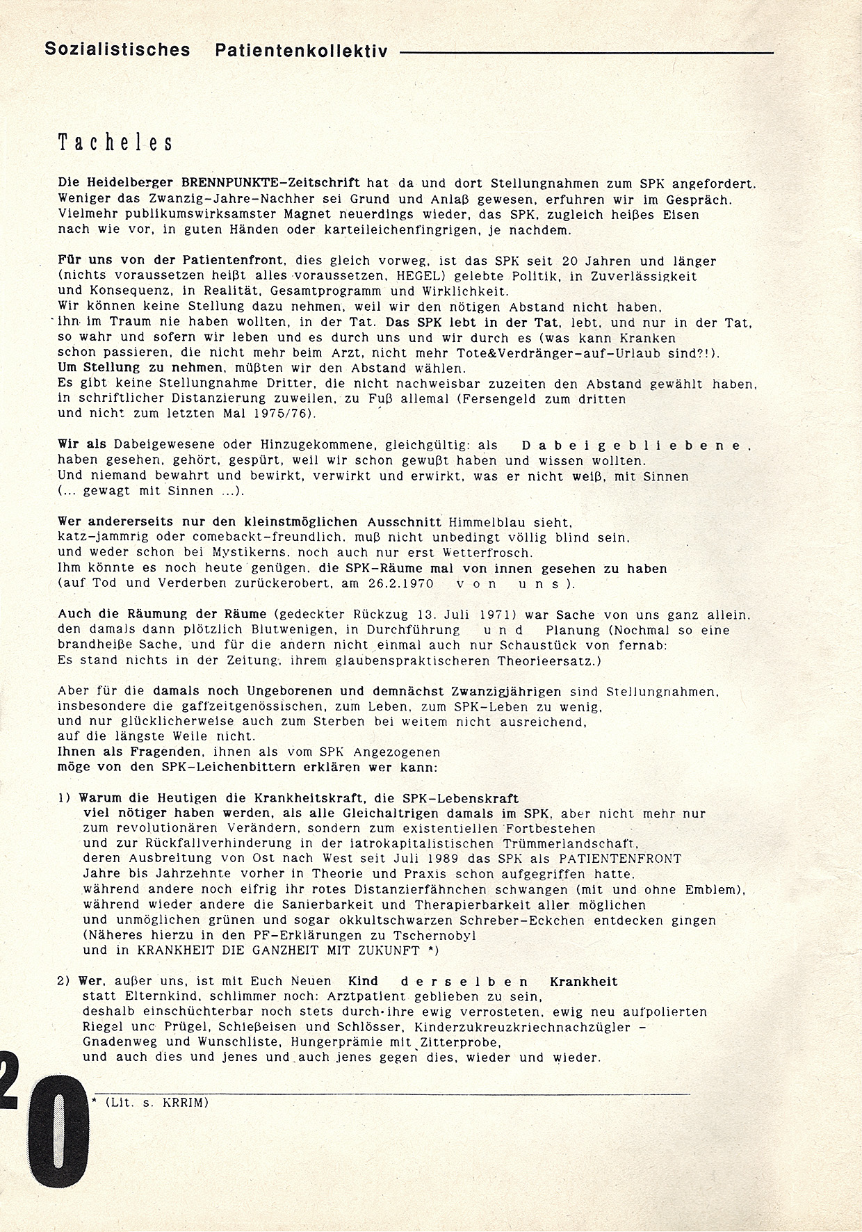 hat da und dort Stellungnahmen zum SPK angefordert. Weniger das Zwanzig-Jahre-Nachher sei Grund und Anlaß gewesen, erfuhren wir im Gespräch. Vielmehr publikumswirksamster Magnet neuerdings wieder, das SPK, zugleich heißes Eisen nach wie vor, in guten Händen oder karteileichenfingrigen, je nachdem.Für uns von der Patientenfront, dies gleich vorweg, ist das SPK seit 20