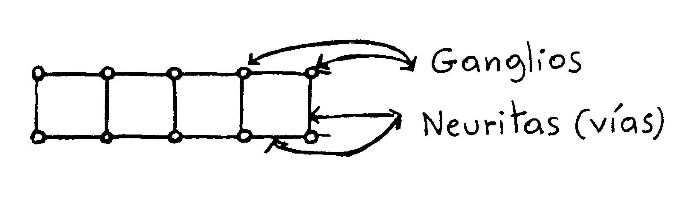 Un modelo relativamente sencillo como ilustración es el sistema nervioso a la manera de una ESCALA DE CUERDA de algunos INSECTOS y GUSANOS, en los cuales la diferenciación entre CENTRAL (cerebro) y PERIFÉRICO (nervios motores y sensibles, neurovegetativos = nervios simpáticos/ parasimpáticos) todavía no existe.